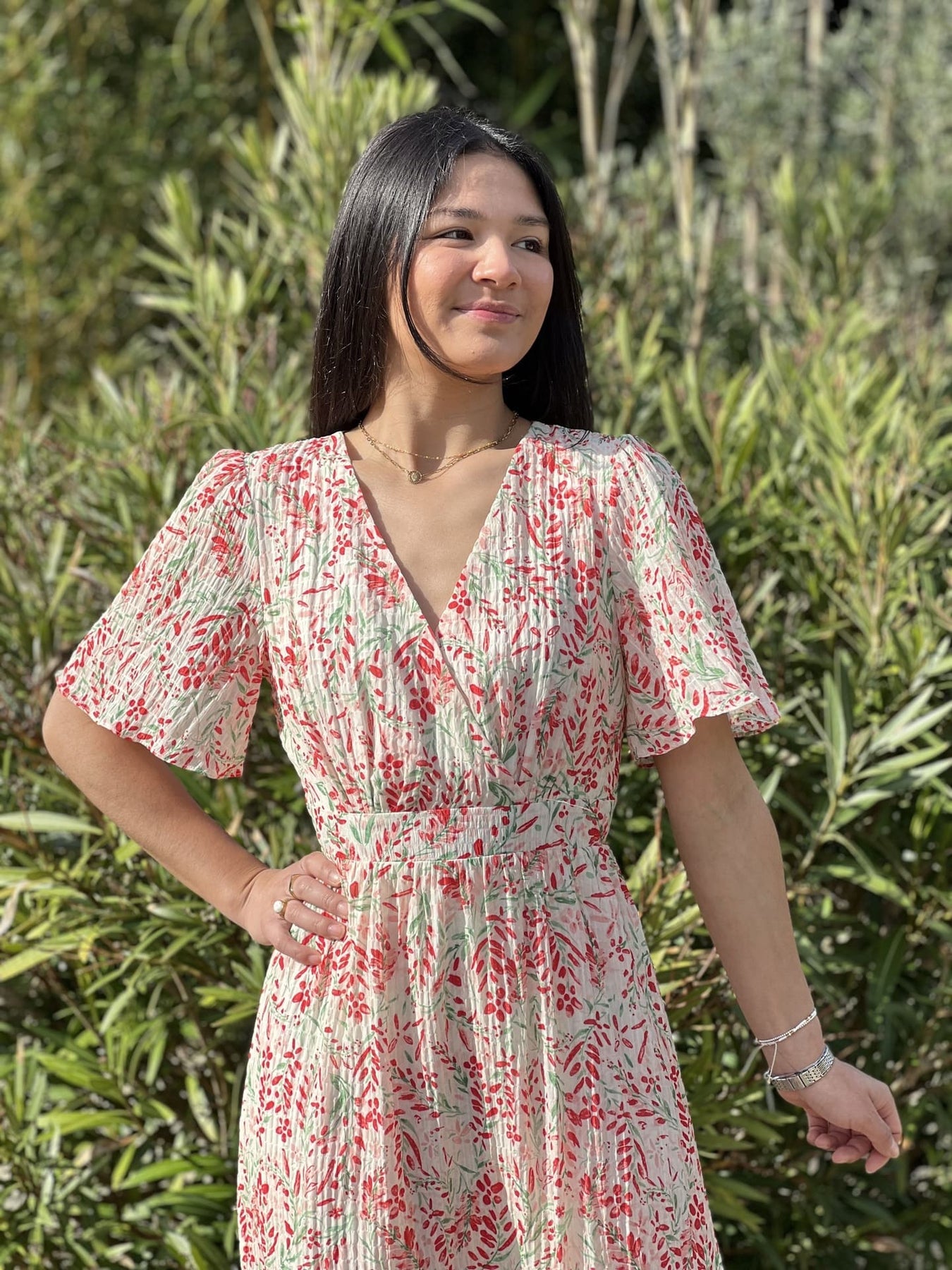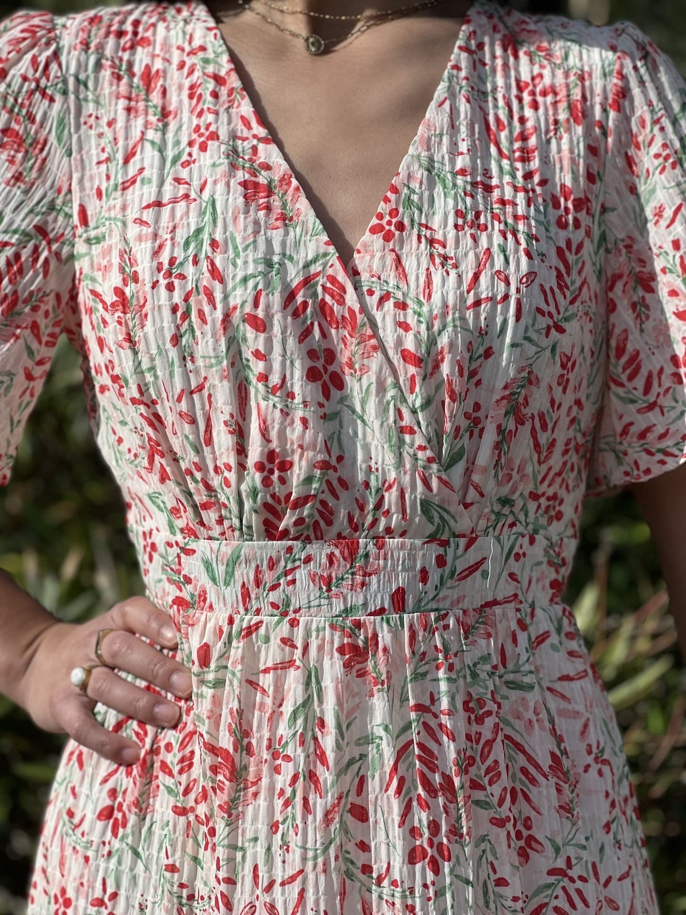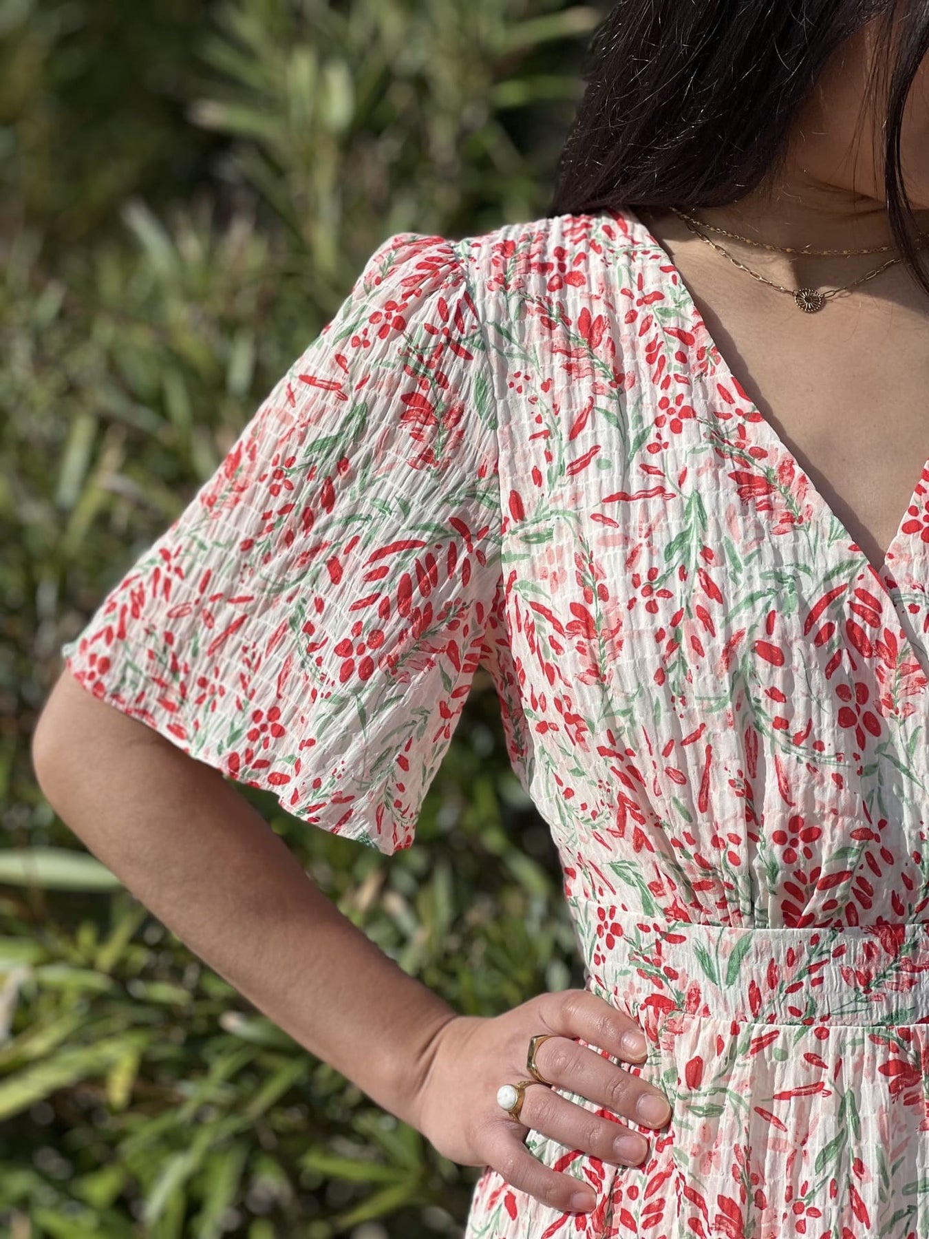 La robe Dahlia est une ode à la douceur estivale – fluide, légère et délicatement plissée. Son imprimé floral rouge sur fond crème respire la fraîcheur, tandis que sa coupe cache-cœur et sa taille marquée valorisent toutes les silhouettes avec élégance.