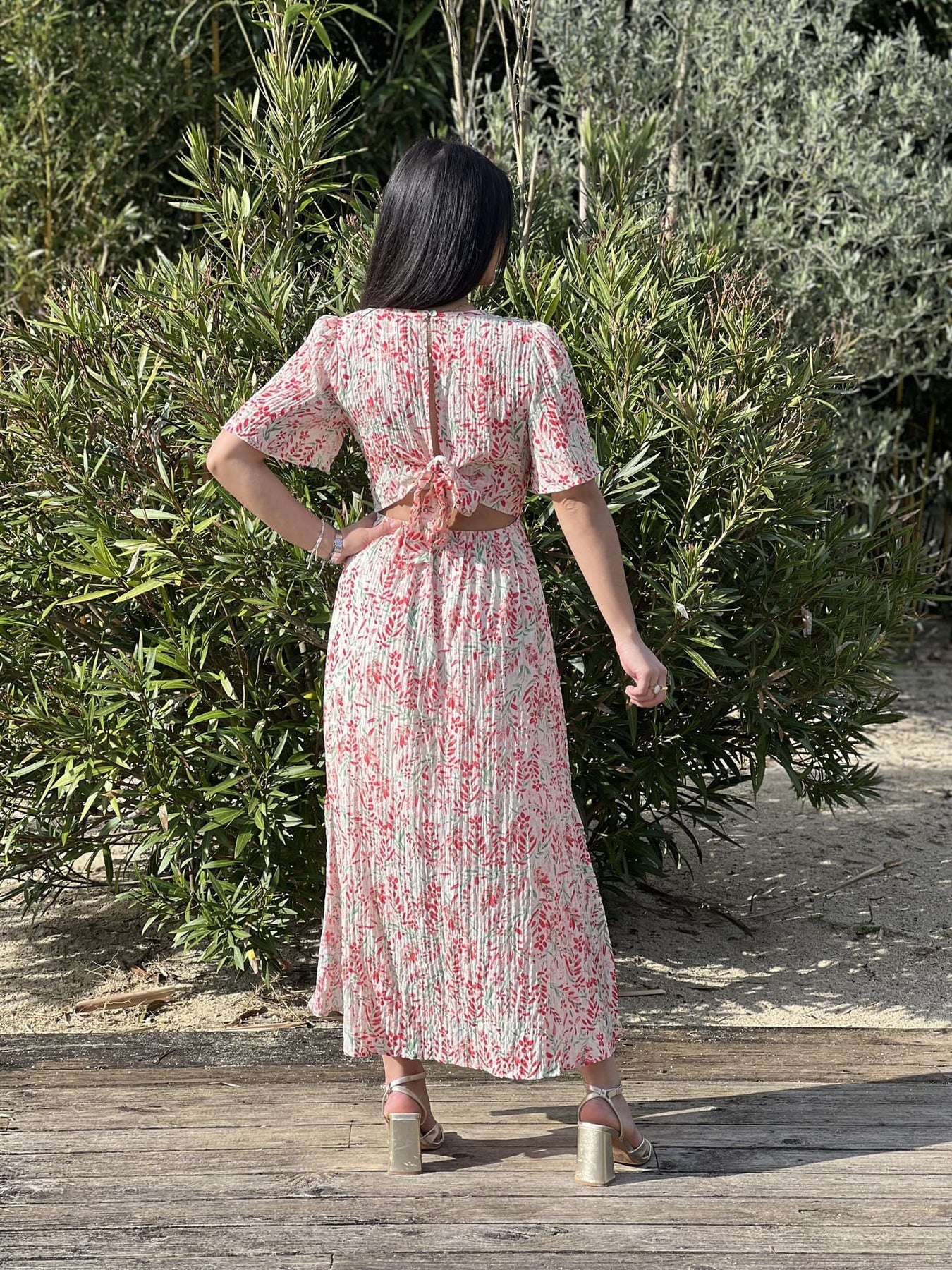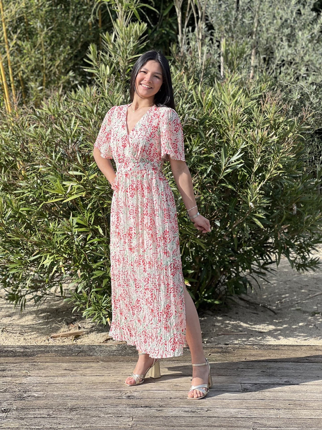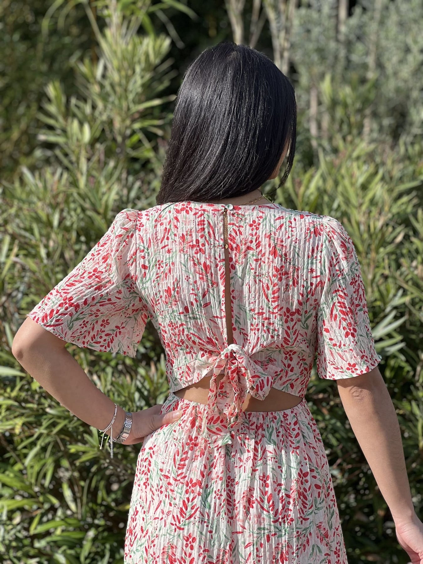 La robe Dahlia est une ode à la douceur estivale – fluide, légère et délicatement plissée. Son imprimé floral rouge sur fond crème respire la fraîcheur, tandis que sa coupe cache-cœur et sa taille marquée valorisent toutes les silhouettes avec élégance.